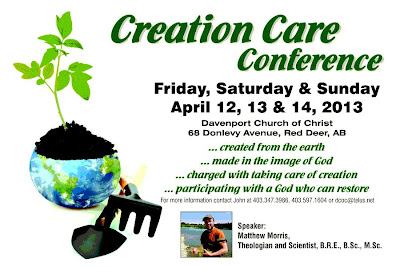 The following is the introduction to a series of talks I gave in Red Deer on April 12-14, 2013, on creation care. This text provides the gist of what I said, but of course I riffed a bit. I also had PowerPoint images to go along with this talk. Note that when I talk about creation, I am in no way disparaging evolution. One can affirm creation and evolution, without doing too much damage to the definition of either.